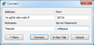 Si vous n'avez pas Teamspeak, vous pouvez le trouvez à cette adresse (Teamspeak3 Client) : http://www.teamspeak.com/?page=downloads